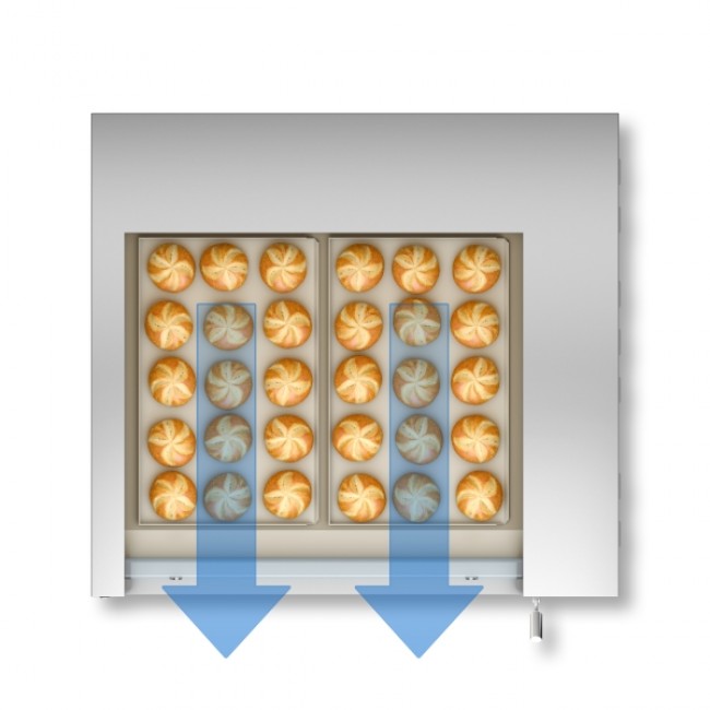 Każda komora posiada własne sterowanie. Niezależność parametrów pieczenia pozwala na wypiek różnego asortymentu w tym samym czasie. Moduł z podwójną komorą. Wygodny w odpieku sklepowym. Wersja ekonomiczna ze względu na 1 sterowanie i podwójną powierzchnię wypiekową. Komory mają niestandardowa wysokość 13 cm, idealne do odpieku bułek, croissantów, rogalików etc. Komory wypiekowe wyłożone płytami kamiennymi.